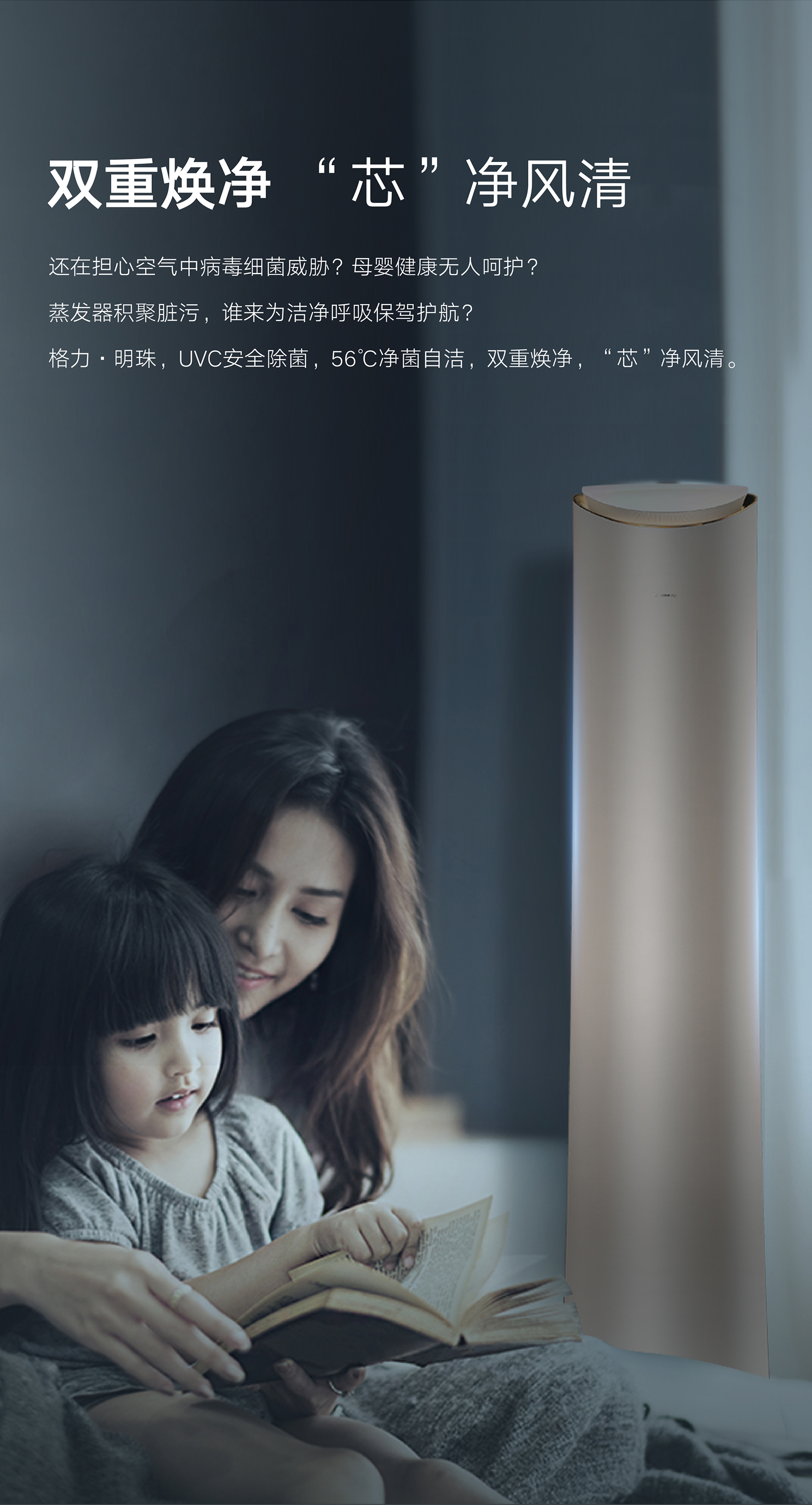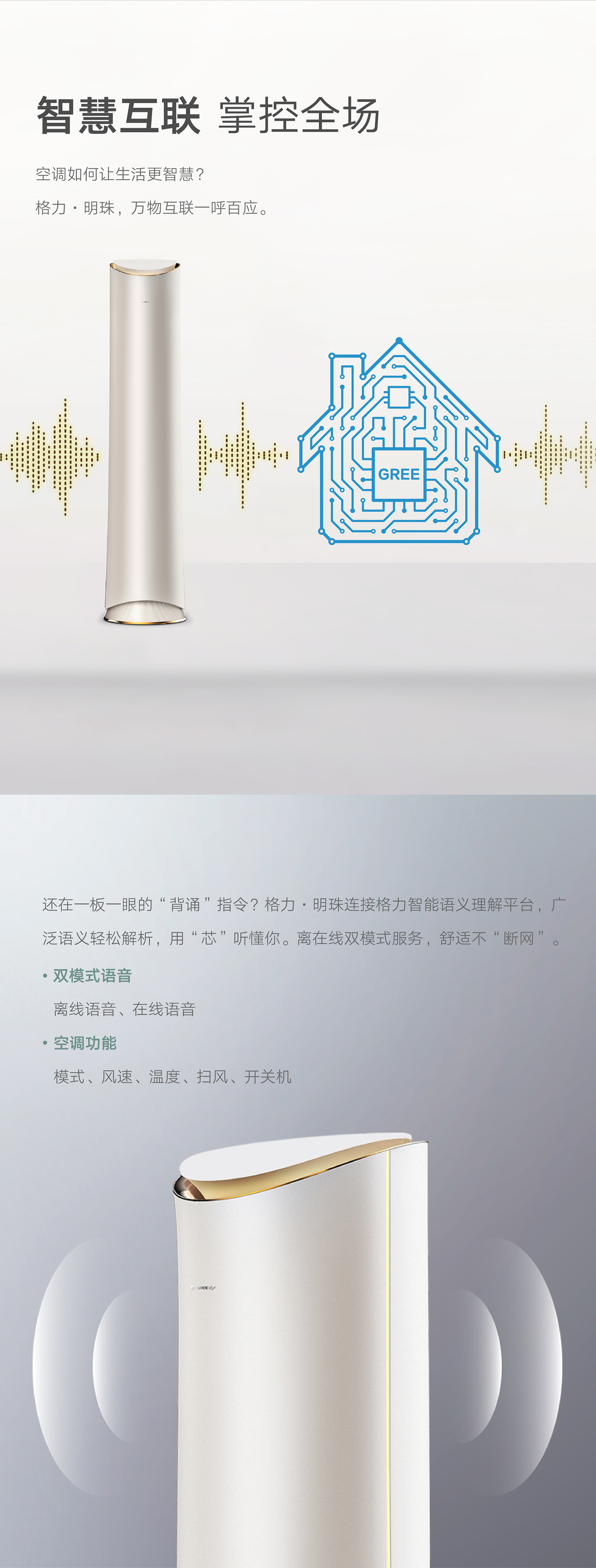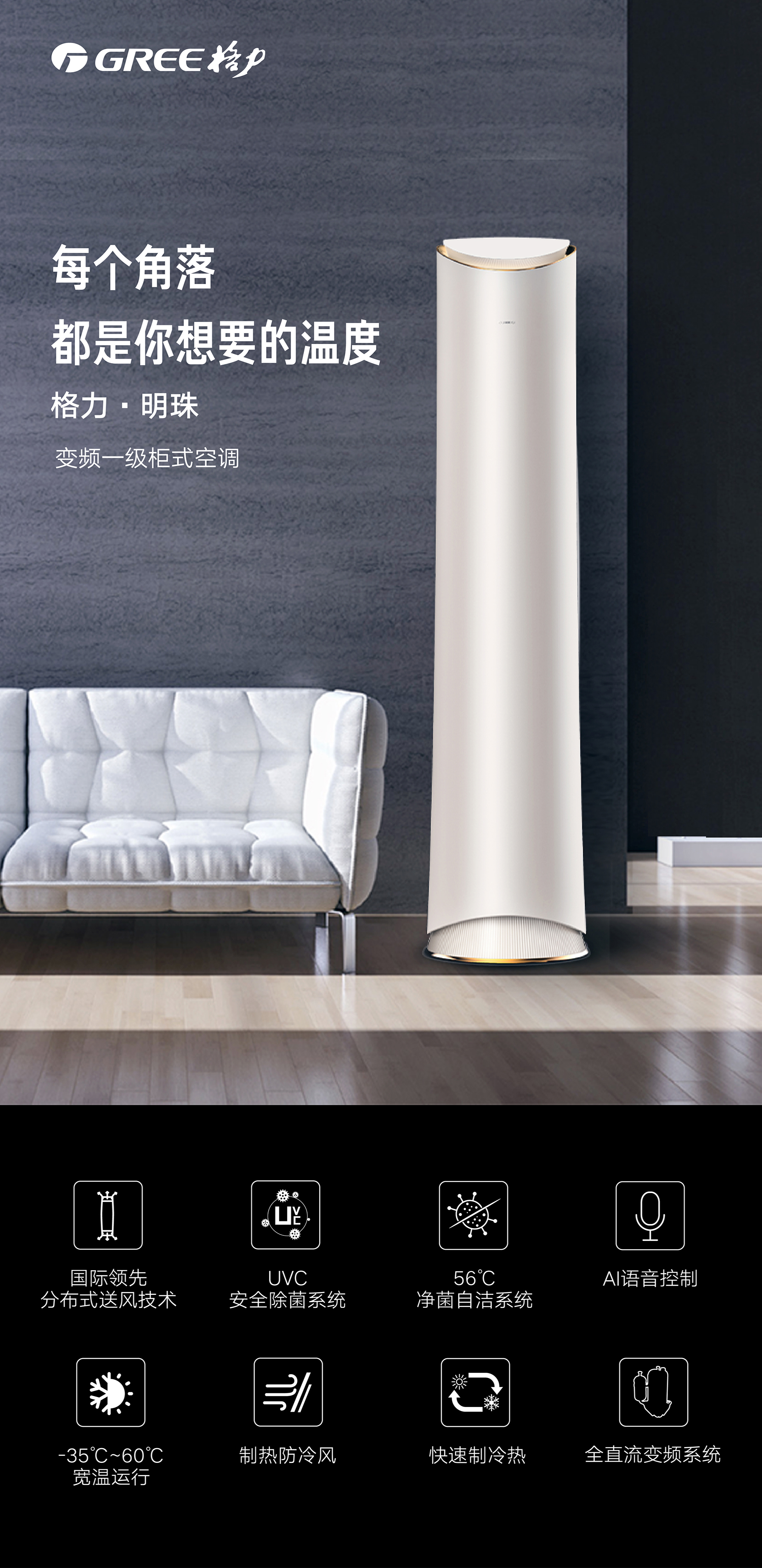 格力·明珠,明珠璀璨,風華絕代。國際領先分布式送風技術,每個角落都是你想要的溫度。格力AI語音控制技術,言出即行。