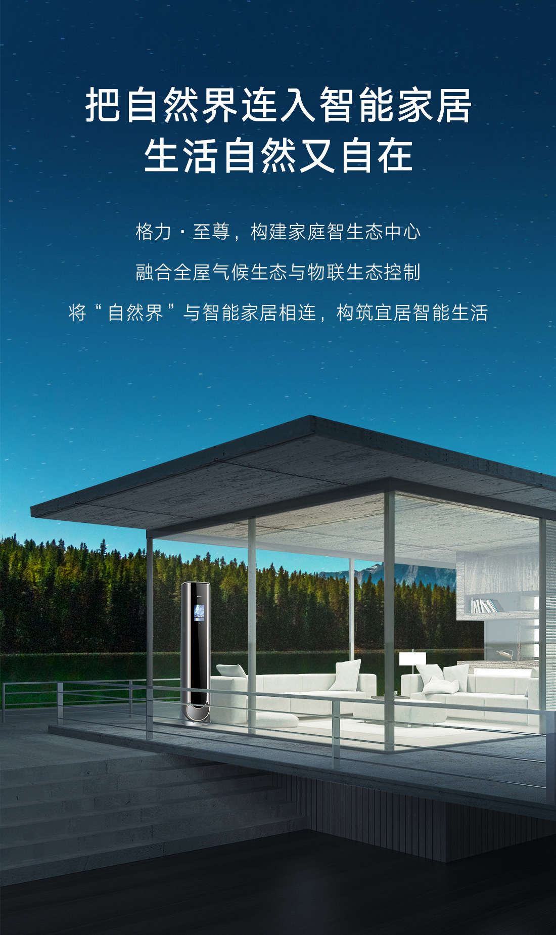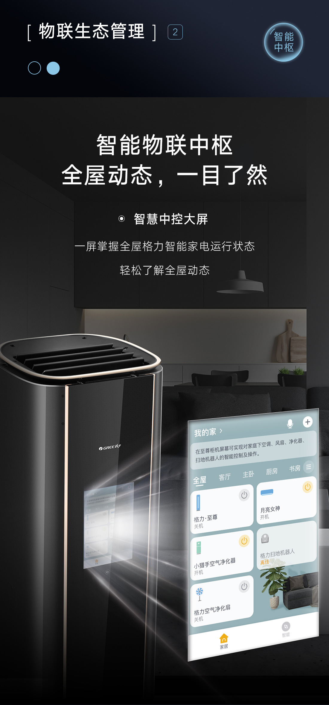 格力·至尊家庭智生態中心,一機多能,融合全屋氣候與物聯管理,集溫、風、濕、凈、鮮五維氣候控制,締造全屋宜居環境,享受自然又自在的生活體驗